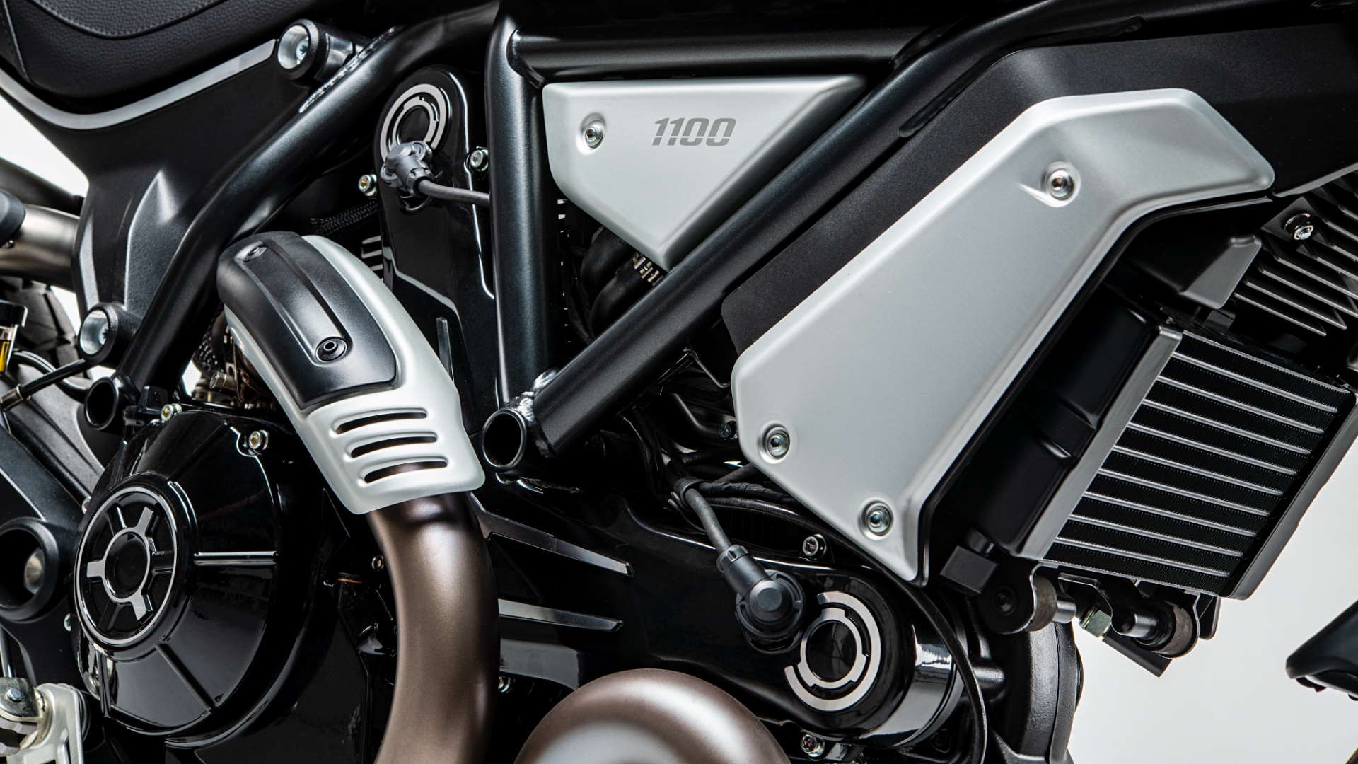Двигатель Scrambler 1100 Dark PRO — L-Twin объемом 1079 см³ с двумя клапанами на цилиндр и воздушно-масляным охлаждением, который соответствует нормам Евро-5. Диаметр цилиндров — 98 мм, ход поршня — 71,5 мм. Такая конструкция обеспечивает плавное ускорение во всем диапазоне оборотов и простоту управления. Этот двигатель Desmodue оснащен облегченными деталями картера и алюминиевыми фрезерованными крышками сцепления и генератора. Две крышки для ремней также выполнены фрезерованием из алюминия для придания мотоциклу особой индивидуальности.