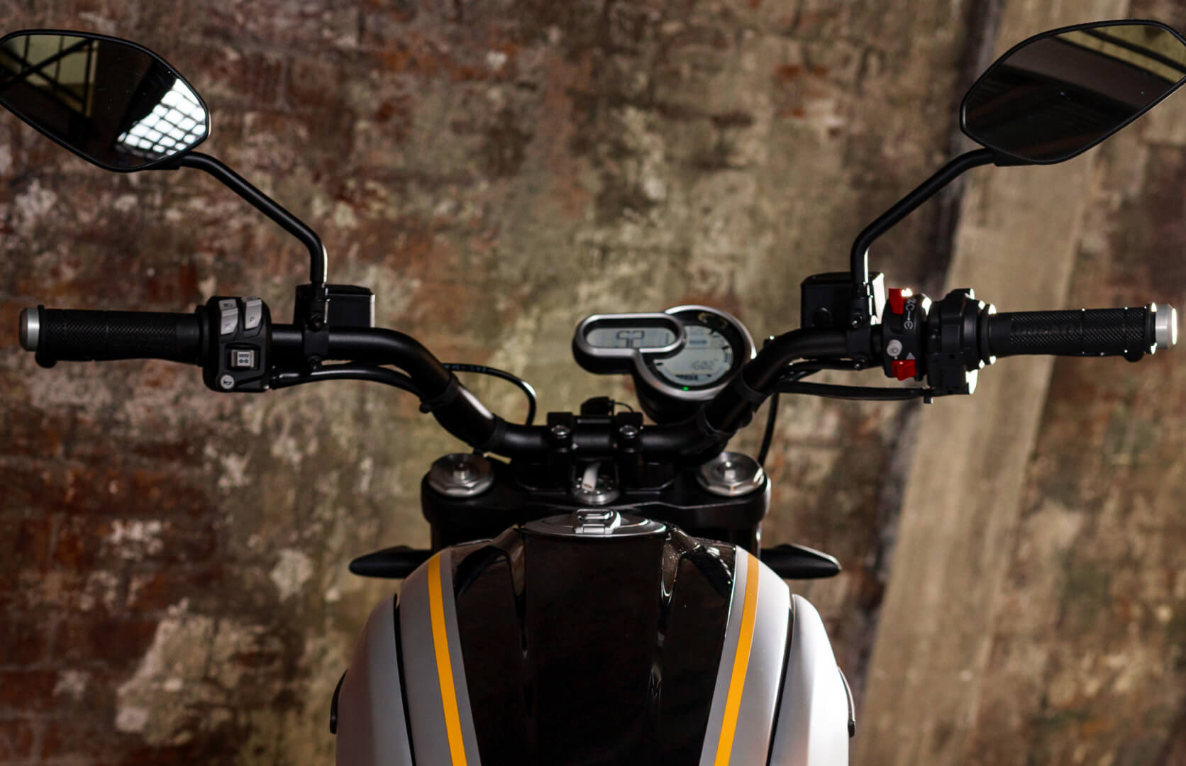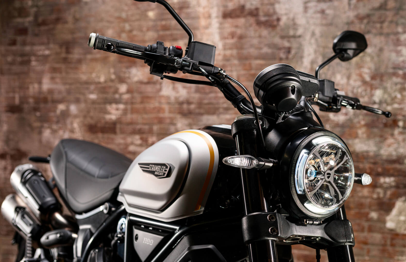 Scrambler 1100 PRO легко узнать даже при ярком дневном свете благодаря характерным дневным ходовым огням. При этом световод, расположенный по контуру фары, выполняет и функцию габаритного света. Перед фарой закреплен металлический элемент черного цвета в форме креста. Он напоминает о традиции наклеивать изоленту для защиты фонаря, которая была распространена еще в 1970-е годы. Вся оптика, установленная в задней части мотоцикла, выполнена на основе светодиодов с эффектом рассеивания на основе технологии, уникальной для мира двухколесной техники.
