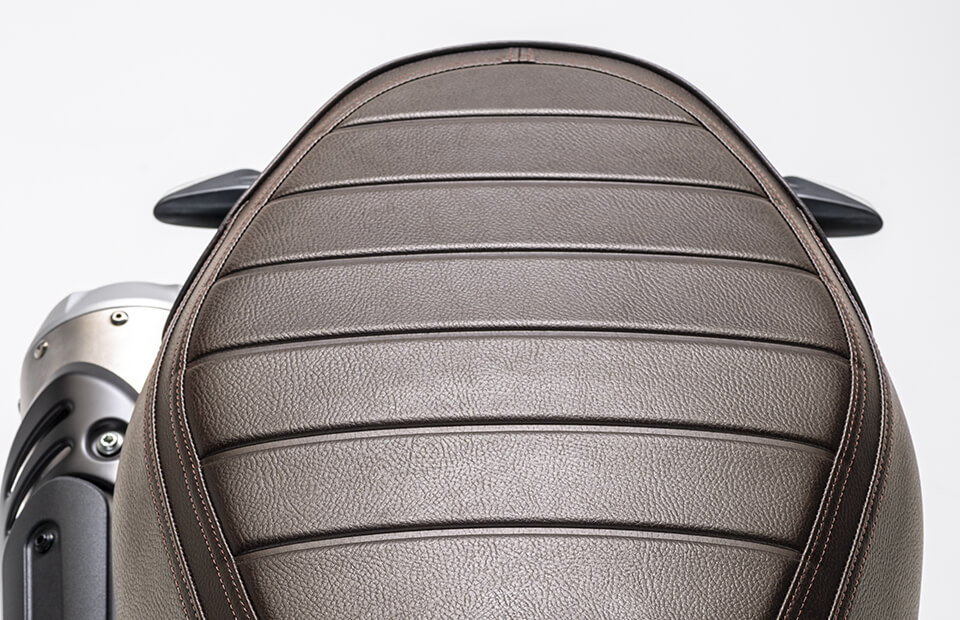 Сиденье со специальной обивкой коричневого цвета, контрастной прострочкой и логотипом Ducati выразительно подчеркивает стильный дизайн мотоцикла.