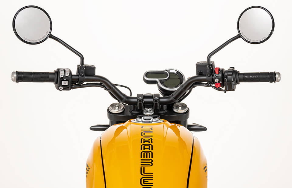 Классические круглые зеркала в стиле того времени являются еще одной заметной особенностью нового Scrambler 1100 Tribute PRO.