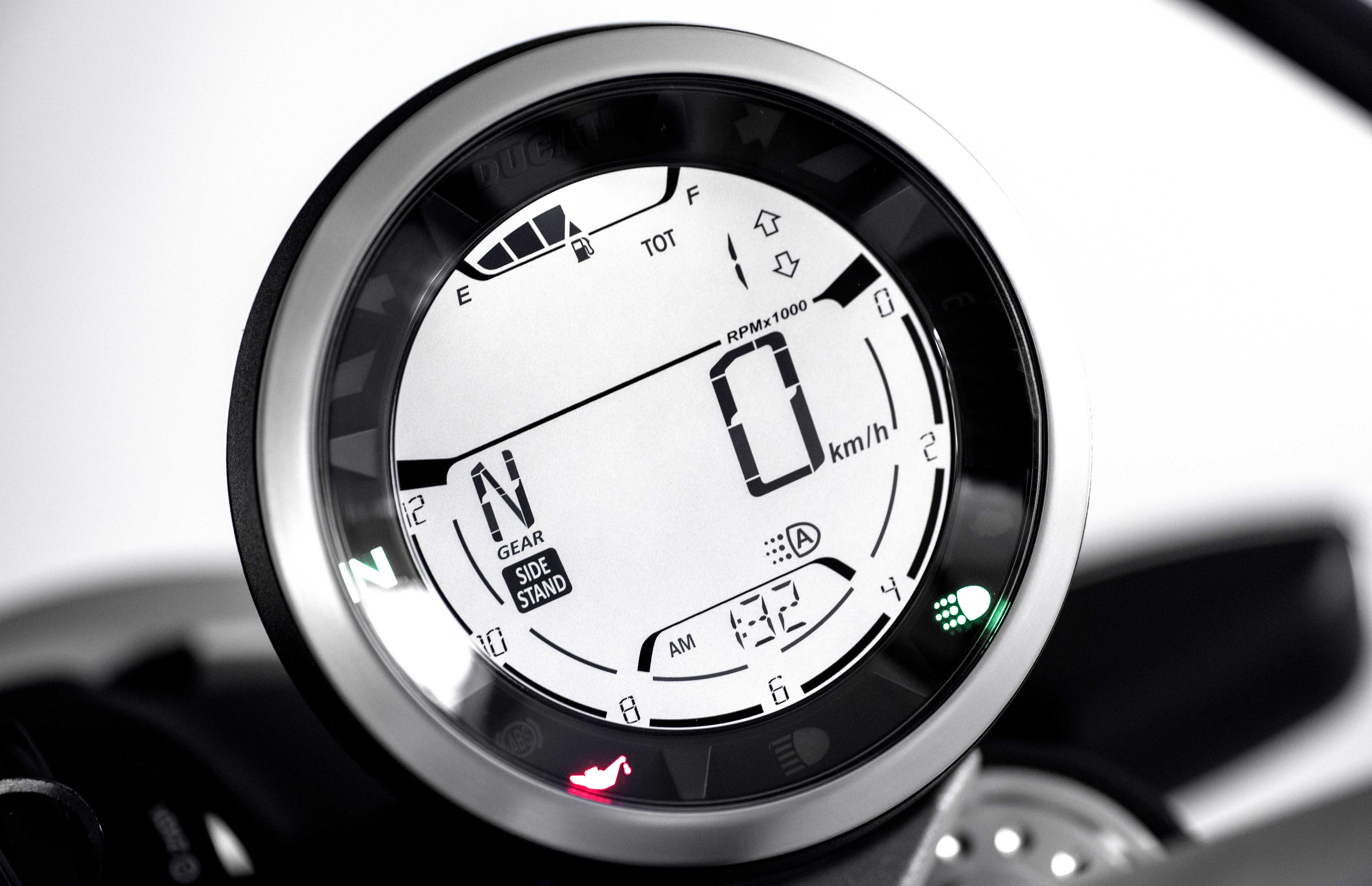 Подготовка к установке мультимедийной системы Ducati. Новые индикаторы включенной передачи и уровня топлива. Новые переключатели на ручках. Сцепление с гидроприводом и регулируемым рычагом. Двухканальная система ABS, функционирующая в том числе в поворотах, в стандартной комплектации.